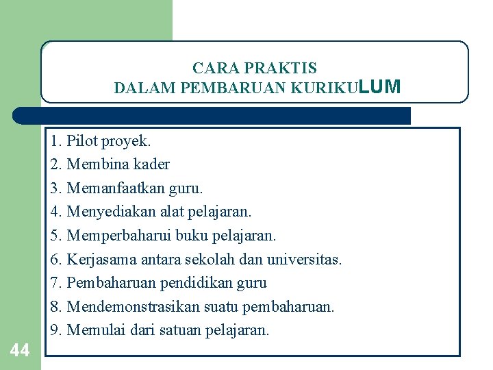 Tujuh prinsip pelaksanaan kurikulum yang harus diketahui. Menunjukkan adanya pengalaman yang terdokumentasi dan terbukti efektif. Dasar pengembangan kurikulum yang lebih fokus pada filosofi rekonstruktivisme.