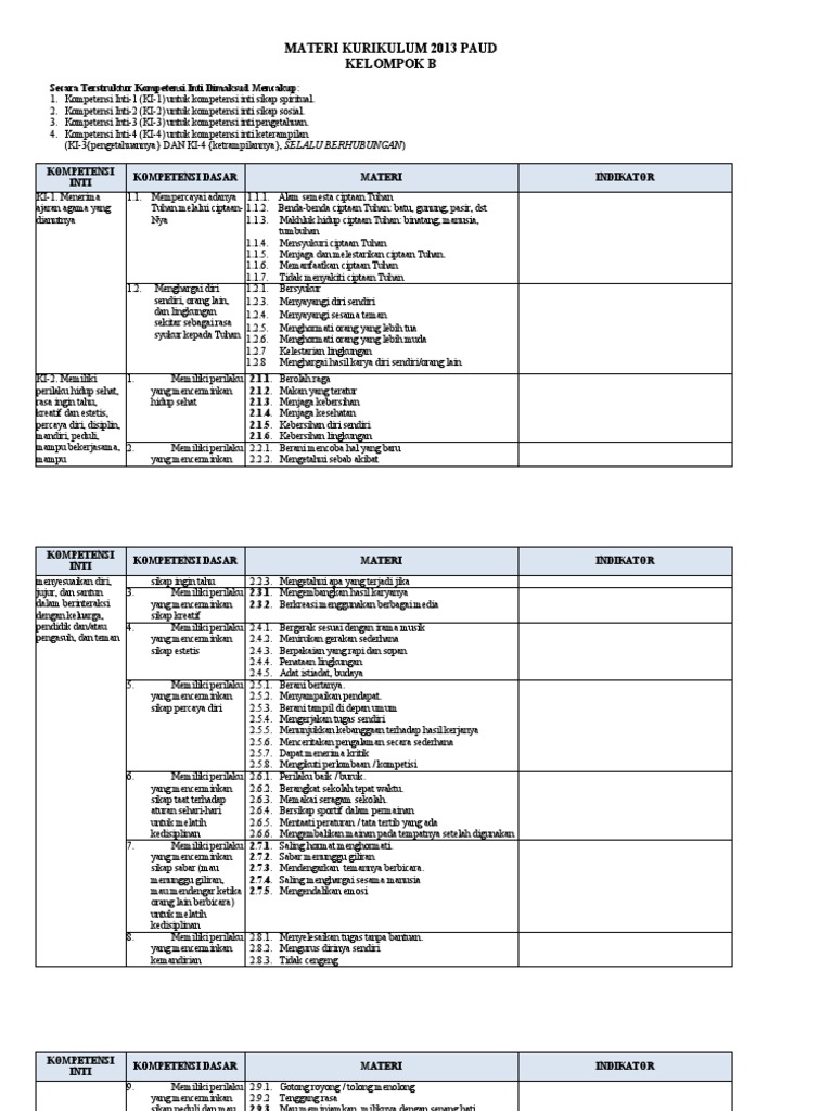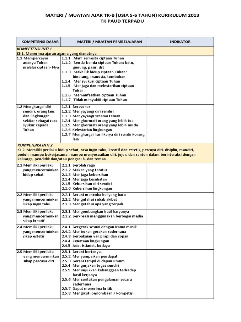 Materi Dan Indikator Paud Kurikulum 2013 Kelompok B Pdf