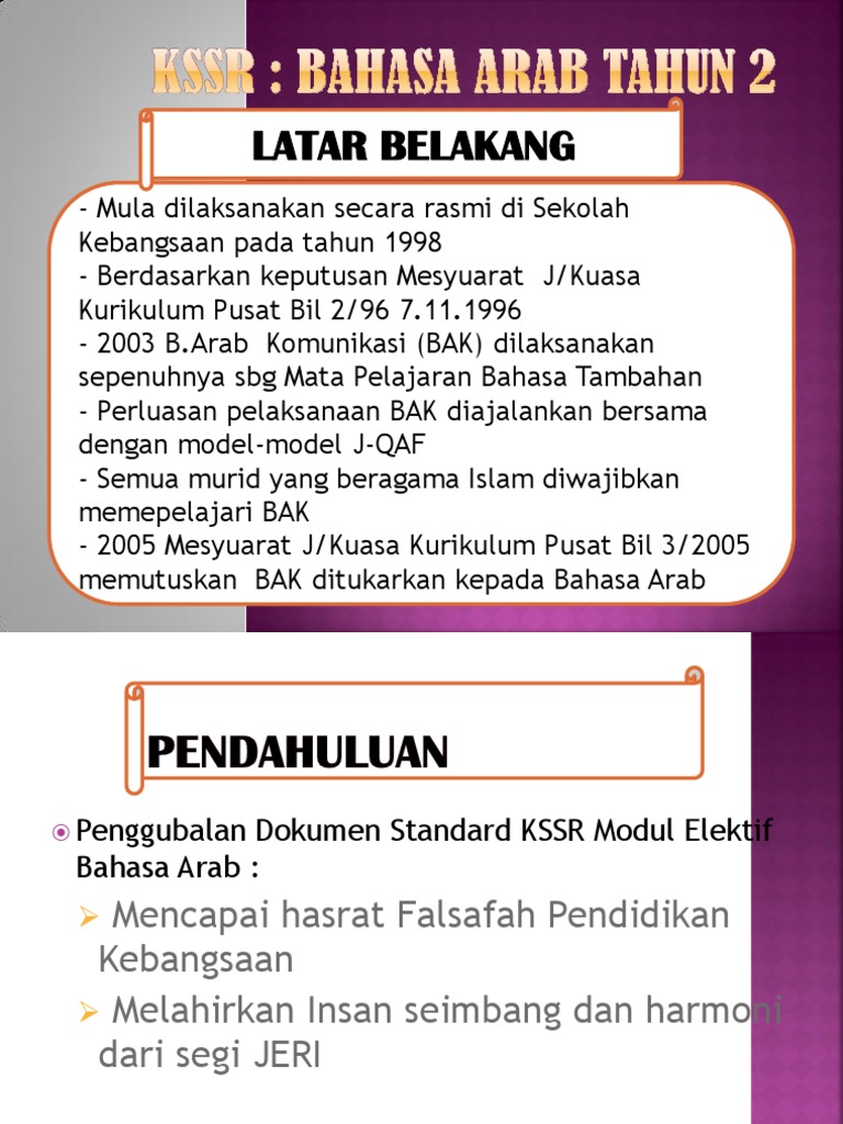 Fungsi Bahasa Arab Bahasa Arab telah mendapat tempat di pusat pengajian Islam seperti pondok dan madrasah. Dalam sejarah perkembangannya hingga sekarang bahasa Arab menjadi kurikulum di sekolah-sekolah dan madrasah-madrasah sebagai penunjang mata pelajaran untuk memahami pelajaran yang berbahasa Arab sekaligus sebagai sarana ilmu pengetahuan yang berkembang di era globalisasi. KSSR BAHASA ARAB TAHUN 3 1 PENDAHULUAN Kurikulum Bahasa Arab peringkat sekolah rendah digubal bertujuan untuk mencapai hasrat Falsafah Pendidikan Kebangsaan dalam melahirkan insan seimbang dan harmonis dari segi intelek emosi rohani dan jasmani.