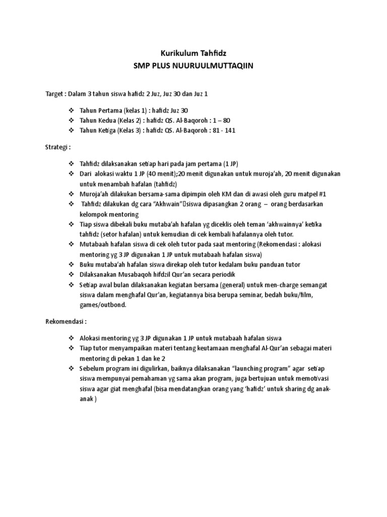 Kurikulum tahfidz juz 30. Manajemen kurikulum yang dijalankan oleh pondok pesantren Ibnu Katsir di mana setiap tahapnya yang. Mampu mengenal makhraj dan sifat huruf. Selain santri dibekali dengan tahfidz 30 juz untuk bekal kembalinya santri ke masyarakat pasca menjalani pendidikan di pondok pesantren tahfidz Nurul Quran santri di bekali dengan penguasaan ilmu-ilmu syariah serta disiplin ilmu yang lain seperti Ulumul Quran Hadits Tauhid Akhlak Siroh Nabawiyah Shorof Nahwu dan lain lain.