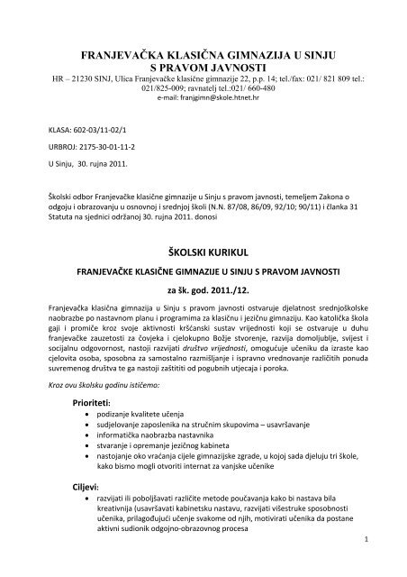 Mojca Kelbič Đajić Škofijska gimnazija Antona Martina Slomška Maribor. ŠKOLSKI KURIKULUM GIMNAZIJE DARUVAR Školska godina 201617. Na temelju članka 27.