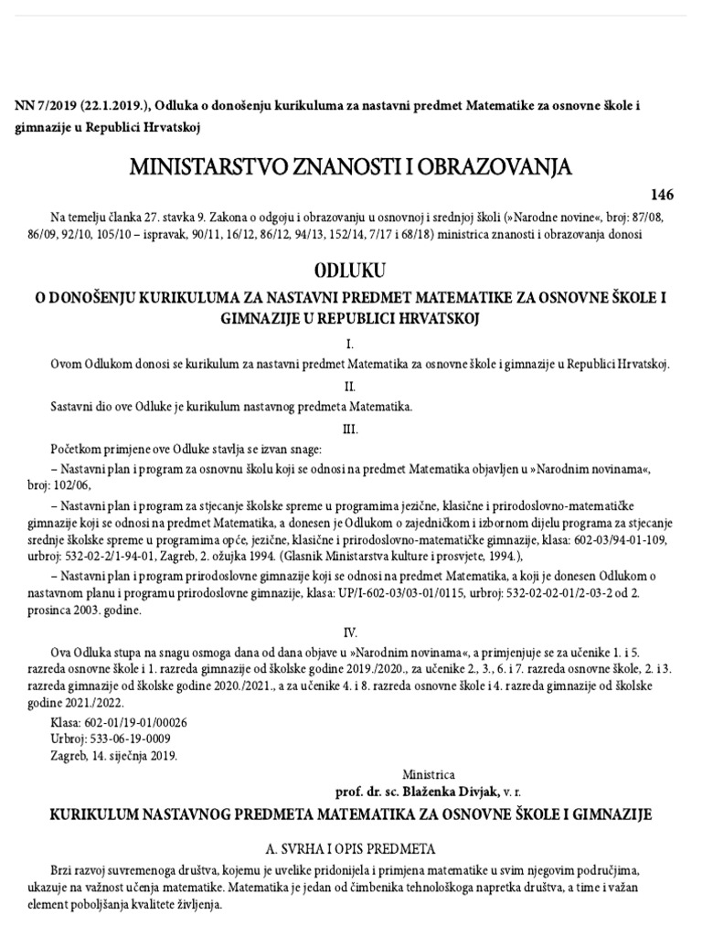 Odluka O Donosenju Kurikuluma Za Nastavni Predmet Matematike Za Osnovne Skole I Gimnazije U Republici Hrvatskoj
