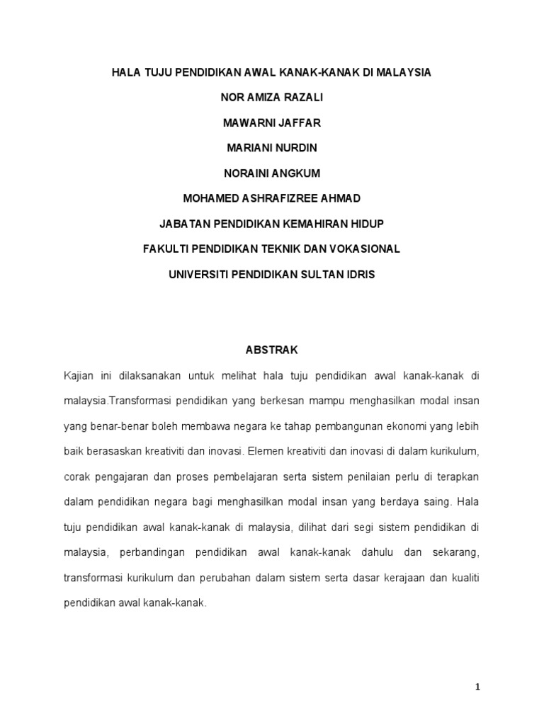 Pendidikan Awal Kanak-kanak di Malaysia merujuk kepada program-program yang disediakan untuk kanak-kanak yang berumur sejak lahir sehingga lapan tahun Discover the worlds research 20 million members. LATAR BELAKANG TOKOH 4. Tambahan pula konsep pendidikan awal kanak-kanak di Malaysia adalah mengikut dua peringkat berdasarkan tahap umur kanak-kanak.