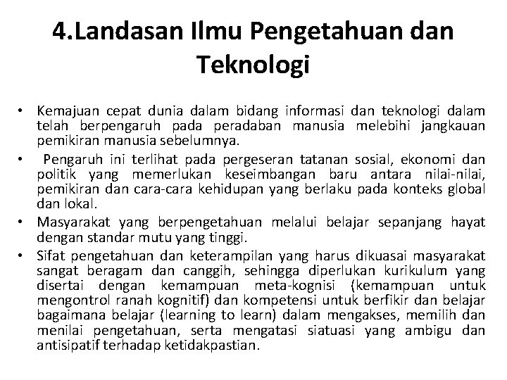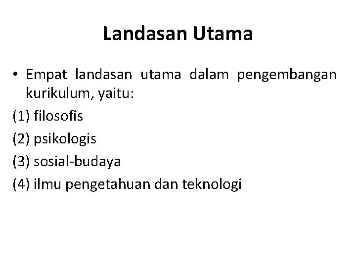Dan 4 ilmu pengetahuan dan teknologiUntuk lebih jelasnya di bawah ini akan diuraikan secara ringkas keempat landasan tersebut. Landasan pengembangan kurikulum memiliki peranan yang sangat signifikan sehingga apabila kurikulum diibaratkan sebagai sebuah bangunan gedung atau rumah yang tidak menggunakan landasan atau pondasi yang kuat maka ketika diterpa angin atau terjadi goncangan yang kencang bangunan tersebut akan mudah roboh. Dan 4 ilmu pengetahuan dan teknologiUntuk lebih jelasnya di bawah ini diuraikan secara ringkas keempat landasan tersebut.