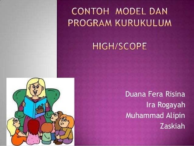 Kurikulum model pembelajaran HighScope Kurikulum HighScope adalah kurikulum yang memiliki filosofi besar untuk anak bangsa bahwa Sekolah itu bukan hanya sekedar MENCETAK anak yang sukses secara akademik tetapi juga memiliki Skill termasuk emosional skill dan social skill. Menirukan gerakan dan suara. Guru membantu anak belajar aktif dengan menyediakan banyak.