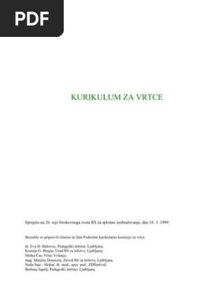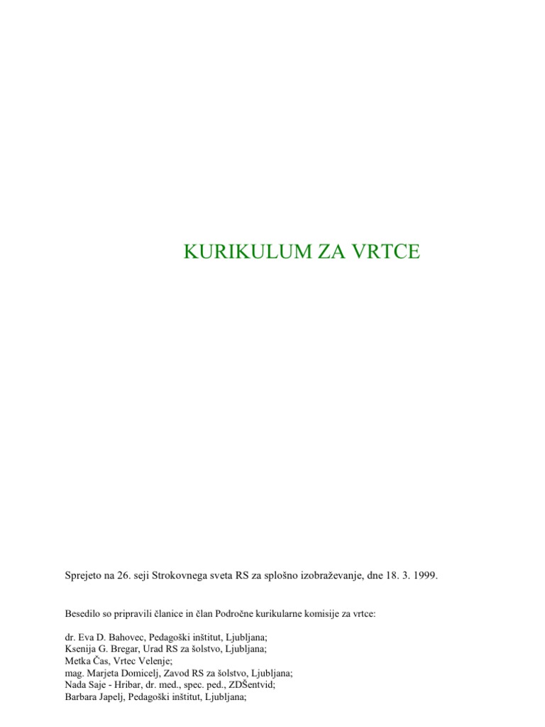 Knaus Maja Avtor Štemberger Tina Mentor Več o mentorju. Cite this work Plain text BibTeX EndNote XML EndNoteRefer RIS ABNT ACM Ref AMA APA Chicago Harvard IEEE ISO 690 MLA Vancouver. Kurikulum je nacionalni dokument sprejet 1831999 Strokovni svet RS za splošno izobraževanje ki na eni strani spoštuje tradicijo slovenskih vrtcev na drugi strani pa z novejšimi teoretskimi pogledi na zgodnje otroštvo in iz njih izpeljanimi rešitvami in pristopi dopolnjuje spreminja in nadgrajuje delo v vrtcih.